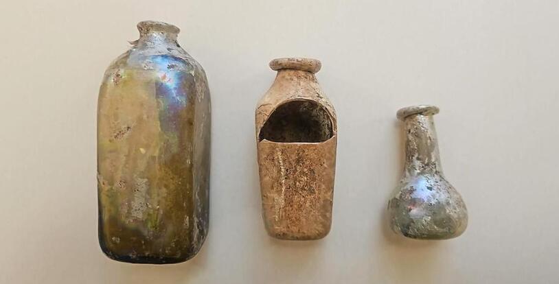 Среди находок — три аптечных сосуда, будто сошедших со страниц старинного трактата. Самый древний, изогнутый, как лепесток на ветру, относится к началу XVIII века, а его собратья, строгие и геометричные, — к его закату. Они пережили века, словно запертые в капсуле времени, чтобы теперь рассказать нам о том, как стекло превращалось в искусство.