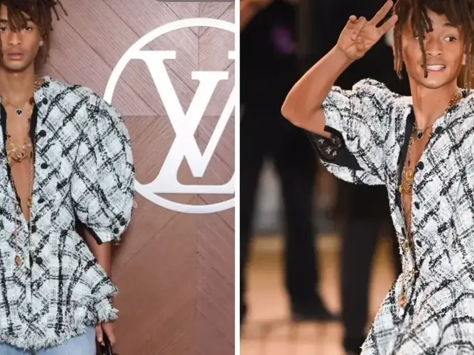 Джейден Смит, словно художник, рисующий на холсте моды, вновь доказал, что стиль не имеет пола. На показе Louis Vuitton в рамках Недели моды в Париже он появился в черно-белом твидовом пиджаке с пышным силуэтом, который идеально сочетался с джинсами светлого оттенка и миниатюрной сумкой Petite Malle. Его образ, словно манифест, напомнил миру, что мода — это не просто одежда, а способ самовыражения.